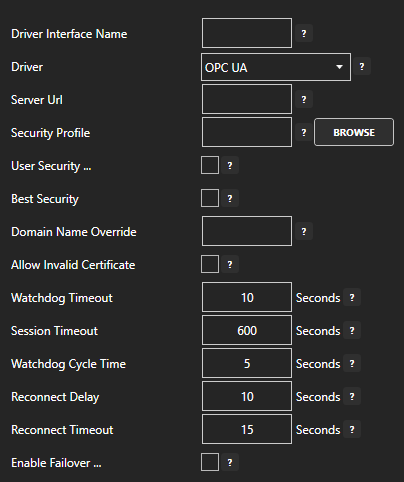 - Enter a meaningful Driver Interface Name that you will refer to this physical connection when defining Tags with a OPC UA Data Source.
