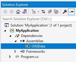 Microsoft Visual Studio 2015+ is recommended. For developing cross-platform .NET Standard or .NET Core solutions, Visual Studio 2019+ is recommended. For developing Android and/or iOS solutions, be sure to include Xamarin extensions to Visual Studio. After creating a new Visual Studio project, add a reference to the OASData assembly and all its dependencies, found in the OAS installation directory. This is typically: