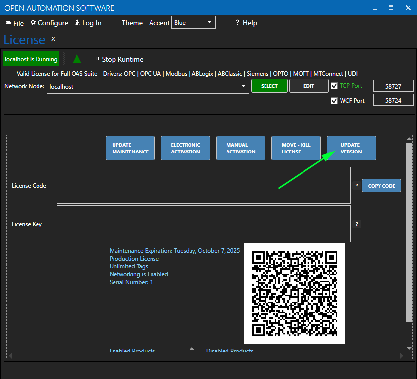 If it is current you can proceed with the update. If the maintenance is expired click on the UPDATE MAINTENANCE button and check the Maintenance Expiration again. If expired copy the License Code found under Configure-License and email to support@oasiot.com to receive an updated License Key.