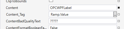 Add an OPCWPFLabel control to the window by double clicking on it in the toolbox. Set the Content_Tag property of the label to the Tag property that you want the label to display. Do this by either typing it in the box if you know the name (they are case-sensitive) or use the ellipse next to the property box. If you are using the demo tag configuration that installs with Open Automation Software use Ramp.Value.