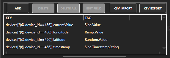 Key/tag pairs are then assigned by clicking Add in the table below the Structure property. This opens a Tag browser which allows you to pick a Tag from the local OAS instance or any reachable remote OAS instance. The key is a search parameter defining where to find the JSON node to fill with the Tag value. This key uses JSONPath syntax and can be either a direct path to the node or a dynamic query to find one or more nodes matching the criteria.