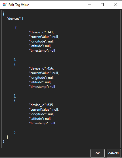 Open Automation Software’s built in MQTT broker allows for the transmission of Modbus data from these remote devices in JSON format. Other data sources including Allen Bradley, Siemens, OPC, MTConnect and OPTO are also supported. OAS allows you to configure your tag’s data source as JSON and create customizable JSON data packets. A Tag with a JSON Data Source can have a base Structure set directly as a valid JSON string, or it can be set using another Tag. This lets you dynamically modify the base structure, or use the same base structure for multiple tags. Below is an example of editing the JSON structure directly.