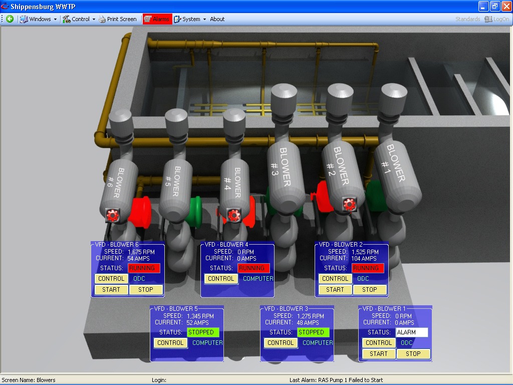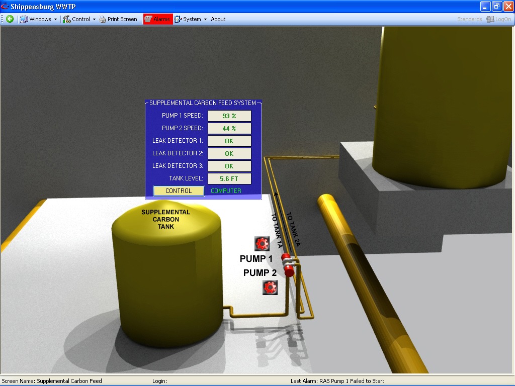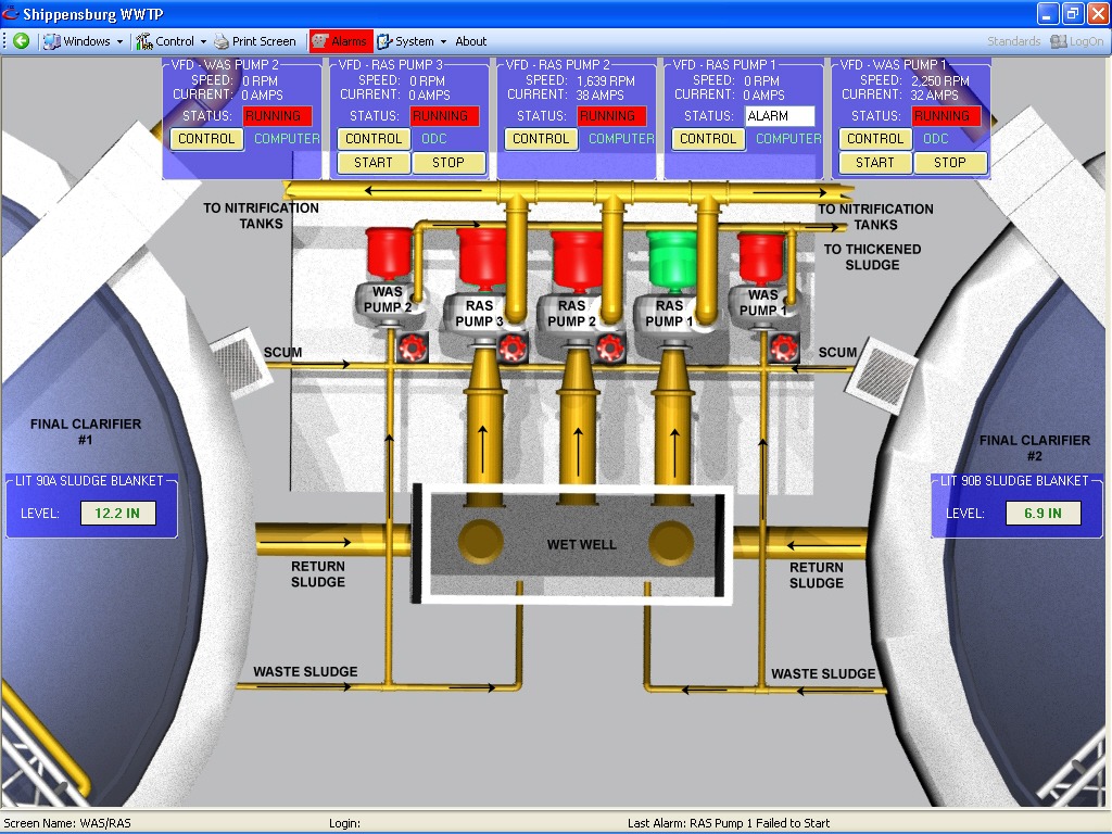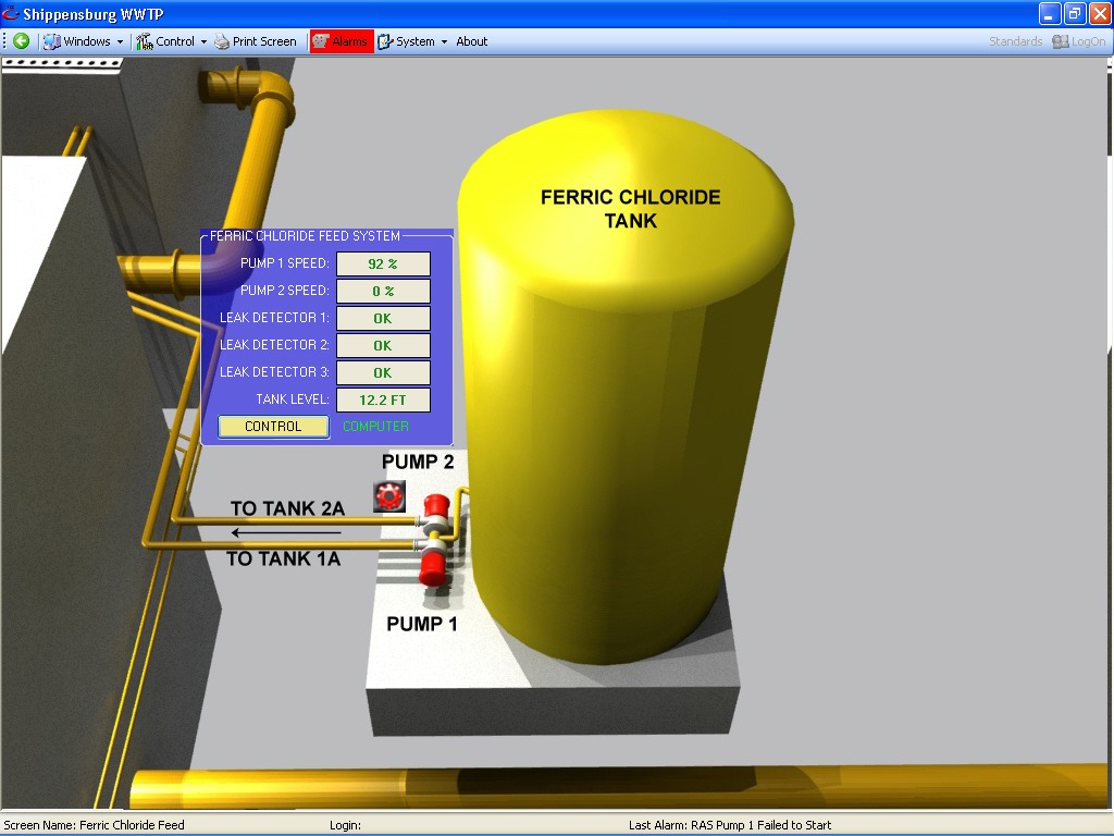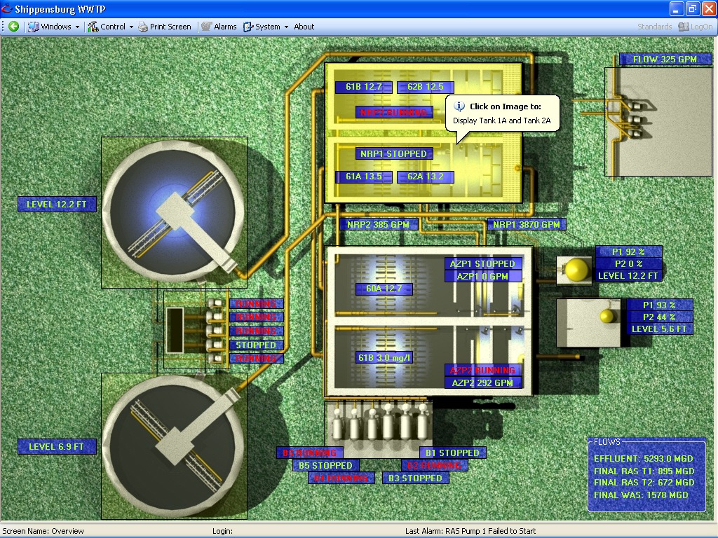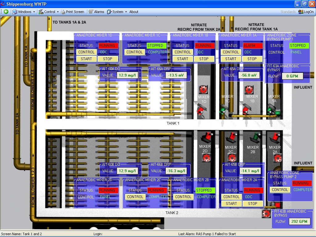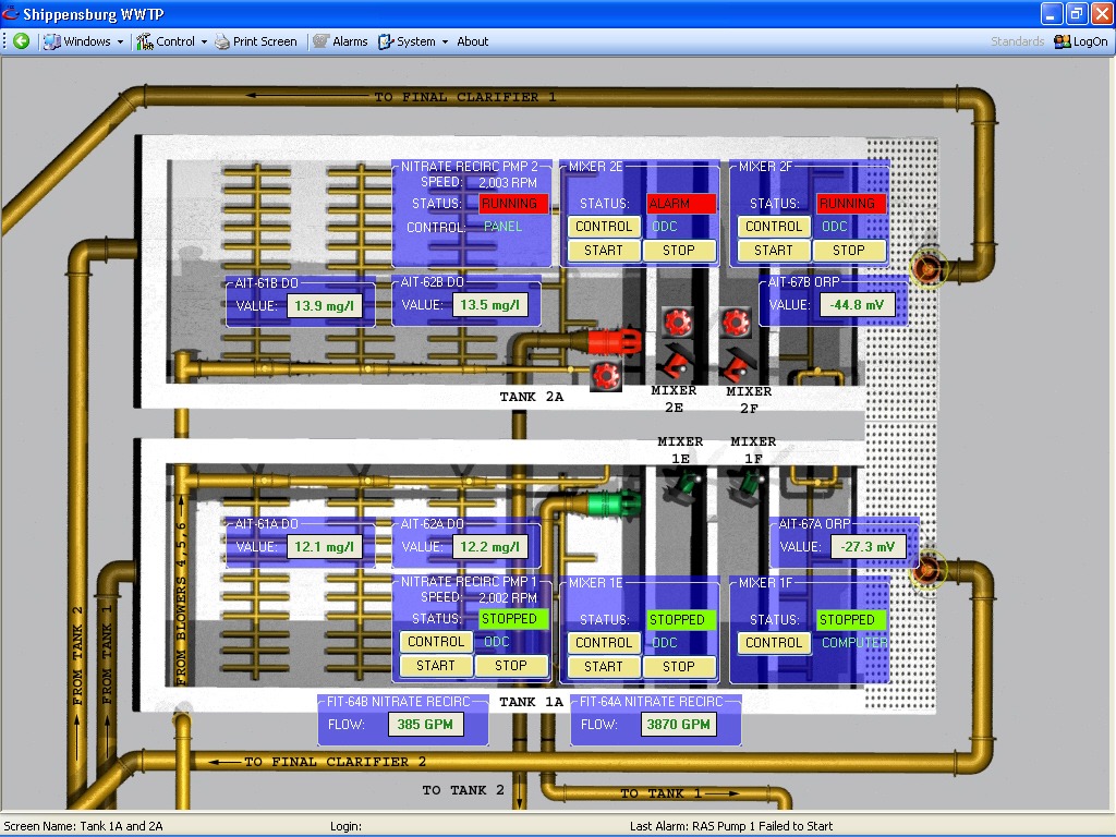 The process required the control of the level of nitrates in the effluent stream based on influent flow and current levels of dissolved oxygen in the system. Furthermore, nitrate re-circulation based on flow needed to be controlled, while also monitoring the dissolved oxygen levels in each tank based on flow and existing DO levels. Another need was the consistent control of Ferric Chloride to the system as required, and based on influent flow