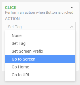 This will perform a navigation to a designated screen. This can be a fixed value, meaning that you pick the screen and the action will always go to it. Or it can be a dynamic value pulled from the value of another Input Component, which you can choose. It is uncommon to use this option, but available. One scenario may be that you use a Combo Box to list available screens, with each option holding the URL of each, and then use a Button to trigger the navigation, making it a two-step operation.