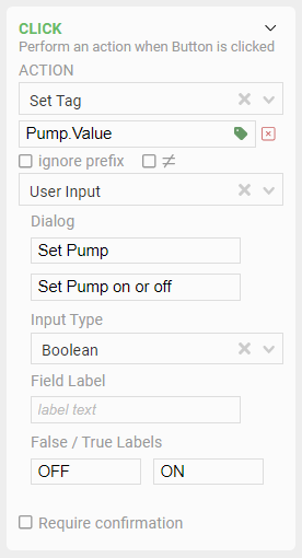 The process of using this handler is to choose the Tag you want to update, and then decide how you want to set it. Your options include Toggle (for simple boolean values), setting a fixed value, using another component’s value, and prompting for user input to enter a value. You can also customize the dialog for user input, so you can change the prompt that is displayed, and choose what type of value to accept. And in all cases, you can opt to require confirmation, so after the user performs the action to set the value, they are given an opportunity to cancel it before any value is sent to the OAS server.