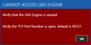 If the OAS Engine is not running on the system or the TCP Port is blocked you will see a warning dialog to start the service.