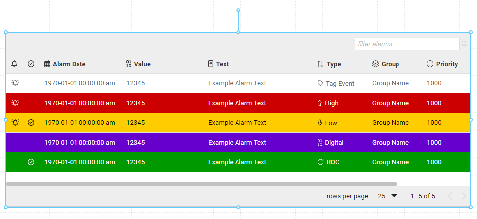 Yes, you can configure the color scheme using CSS, and set filters for alarm data based on priority, alarm state, alarm type, and more.