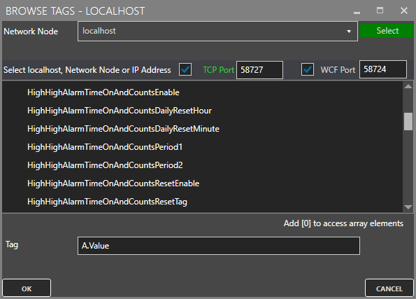 The following image shows how the points will appear for connection in a client if the High High Alarm Limit is enabled for Time On and Counts. You can also use Value or any other Alarm Limit.